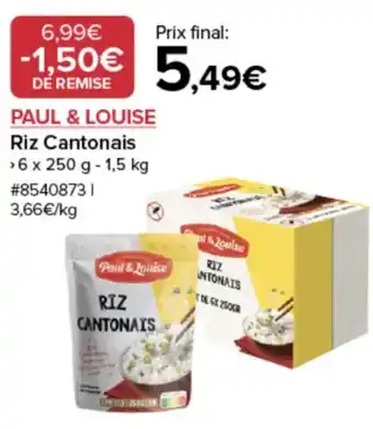 L'offre est disponible dans plusieurs magasins, vérifiez tous les produits pour obtenir le Paul & louise riz cantonais le moins cher. Si vous souhaitez savoir si l'article est en vente avec une plus grosse remise dans un autre magasin, consultez la catégorie 'Grossistes'. Ces offres pourraient aussi vous intéresser : PAUL & LOUISE Plat cuisiné, Riz cantonais & PAUL & LOUISE Plat cuisiné.