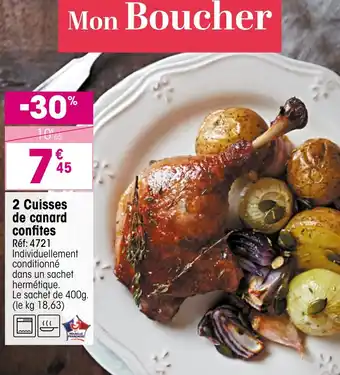 L'offre est disponible dans plusieurs magasins, vérifiez tous les produits pour obtenir le 2 cuisses de canard confites le moins cher. Si vous souhaitez savoir si l'article est en vente avec une plus grosse remise dans un autre magasin, consultez la catégorie 'Supermarché'. Ces offres pourraient aussi vous intéresser : Cuisses de canard confites DOMAINE DE LA BASTINE, Cuisses de canard confites x 4 du Sud-Ouest & Canard - cuisses de confites x 4 du sud-ouest.