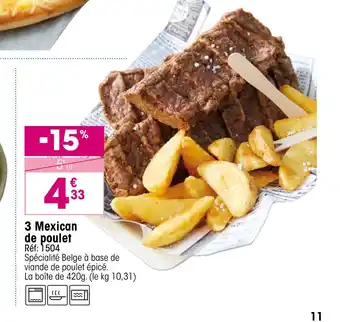 L'offre est disponible dans plusieurs magasins, vérifiez tous les produits pour obtenir le 3 Mexican de poulet le moins cher. Si vous souhaitez savoir si l'article est en vente avec une plus grosse remise dans un autre magasin, consultez la catégorie 'Supermarché'. Ces offres pourraient aussi vous intéresser : Filets de poulet, NEMS AU POULET & Aiguillettes de poulet.