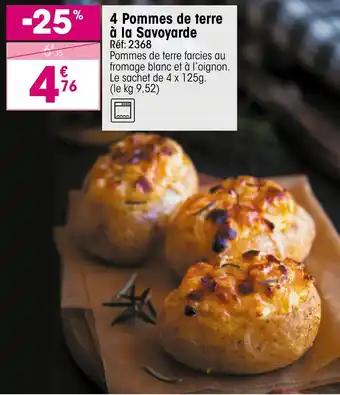 L'offre est disponible dans plusieurs magasins, vérifiez tous les produits pour obtenir le 4 pommes de terre à la savoyarde le moins cher. Si vous souhaitez savoir si l'article est en vente avec une plus grosse remise dans un autre magasin, consultez la catégorie 'Supermarché'. Ces offres pourraient aussi vous intéresser : Pommes de terre farcies à la viande, Churros de pommes de terre & Pommes de terre farcies à la viande.