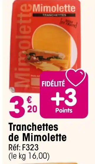 Le prix de l'offre Tranchettes de Mimolette se trouve également en haut de la page, ainsi que la date à laquelle l'offre est disponible. Vous pouvez également vérifier les prix dans le Catalogue Croque Gel actuel ou sur le site Internet de Croque Gel. Les offres vous permettent d'acheter les produits Croque Gel au prix le plus bas.