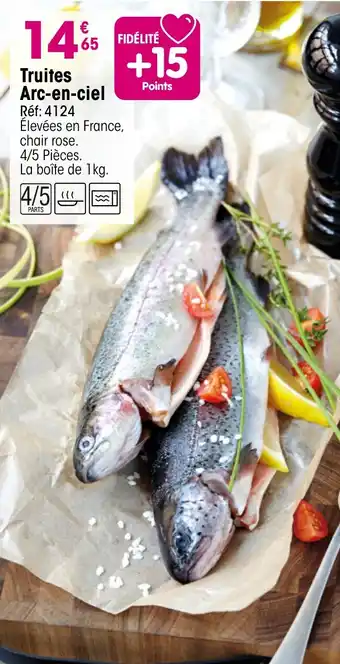 En plus de l'offre Truites arc-en-ciel, Croque Gel propose une large gamme de produits. Consultez le Catalogue Croque Gel hebdomadaire pour découvrir les meilleures offres et promotions. En plus de Truites arc-en-ciel, il y a aussi : 2 truites arc en ciel, Tutu arc-en-ciel & Quo vadis - calendrier arc-en-ciel.
