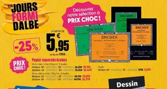 Le prix de l'offre Papier aquarelle Arches se trouve également en haut de la page, ainsi que la date à laquelle l'offre est disponible. Vous pouvez également vérifier les prix dans le Catalogue Dalbe actuel ou sur le site Internet de Dalbe. Les offres vous permettent d'acheter les produits Dalbe au prix le plus bas.