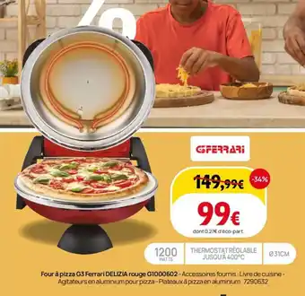 Le prix de l'offre Four à pizza g3 ferrari delizia rouge g1000602 se trouve également en haut de la page, ainsi que la date à laquelle l'offre est disponible. Vous pouvez également vérifier les prix dans le Catalogue Darty actuel ou sur le site Internet de Darty. Les offres vous permettent d'acheter les produits Darty au prix le plus bas.