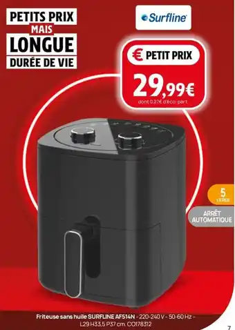 Le prix de l'offre Friteuse sans huile SURFLINE AF514N se trouve également en haut de la page, ainsi que la date à laquelle l'offre est disponible. Vous pouvez également vérifier les prix dans le Catalogue Darty actuel ou sur le site Internet de Darty. Les offres vous permettent d'acheter les produits Darty au prix le plus bas.
