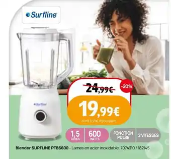 SURFLINE Blender PTBS600 bénéficie actuellement d'une réduction chez Darty. Vous trouverez ici toutes les infos utiles sur les prix, la durée de validité et les conditions de l’offre. Pensez à consulter aussi d'autres offres et promotions similaires pour SURFLINE Blender PTBS600 afin d’acheter toujours au bon prix. La promo SURFLINE Blender PTBS600 est valable du 13-01-2026 au 01-02-2026. Offre terminée ? Pas de souci. D'autres offres sur ces produits sont peut-être déjà disponibles. Vous pouvez suivre cette catégorie de produits pour rester informé en cas de nouvelle promotion SURFLINE Blender PTBS600 chez Darty. En comparant les offres, vous êtes sûr d’acheter au prix le plus bas possible.Questions fréquemment posées au sujet de SURFLINE Blender PTBS600