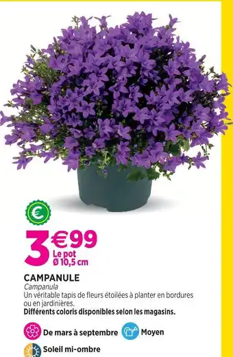 L'offre est disponible dans plusieurs magasins, vérifiez tous les produits pour obtenir le Campanule le moins cher. Si vous souhaitez savoir si l'article est en vente avec une plus grosse remise dans un autre magasin, consultez la catégorie 'Jardineries et Animaleries'. Ces offres pourraient aussi vous intéresser : Campanule, Campanule & Campanule.