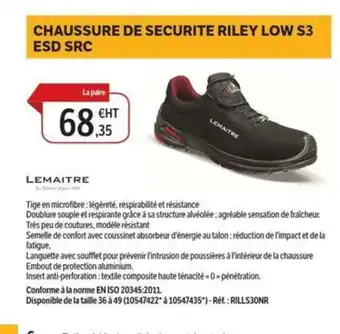 LEMAITRE Chaussure de securite riley low s3 esd src : offres et promos DomPro à découvrir