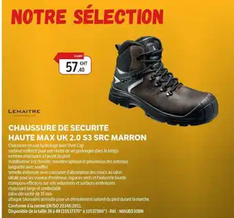 Actuellement en offre chez DomPro : LEMAITRE Chaussure de securite haute max uk 2.0 s3 src marron ✅ Valable du 16-09 au 31-12.