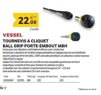 Offre VESSEL Tournevis a cliquet ball grip porte-embout mbh chez DomPro