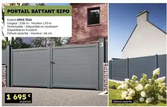 L'offre est disponible dans plusieurs magasins, vérifiez tous les produits pour obtenir le Portail battant sipo le moins cher. Si vous souhaitez savoir si l'article est en vente avec une plus grosse remise dans un autre magasin, consultez la catégorie 'Bricolage'. Ces offres pourraient aussi vous intéresser : PORTAIL ALUMINIUM BATTANT ASTIA, PORTAIL COMPOSITE BATTANT DELFIS & PORTAIL ALUMINIUM BATTANT VENTO.