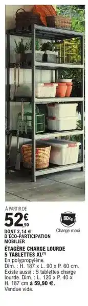 L'offre est disponible dans plusieurs magasins, vérifiez tous les produits pour obtenir le Dim - estuche charge lounge e tablettes ail le moins cher. Si vous souhaitez savoir si l'article est en vente avec une plus grosse remise dans un autre magasin, consultez la catégorie 'Bricolage'. Ces offres pourraient aussi vous intéresser : ÉTAGÈRE CHARGE LOURDE 5 TABLETTES, ÉTAGÈRE CHARGE LOURDE 5 TABLETTES & ÉTAGÈRE XL CHARGE LOURDE 5 TABLETTES.