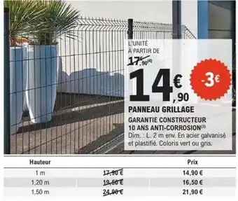Le prix de l'offre Dim - panneau grillage se trouve également en haut de la page, ainsi que la date à laquelle l'offre est disponible. Vous pouvez également vérifier les prix dans le Catalogue E.Leclerc Brico actuel ou sur le site Internet de E.Leclerc Brico. Les offres vous permettent d'acheter les produits E.Leclerc Brico au prix le plus bas.