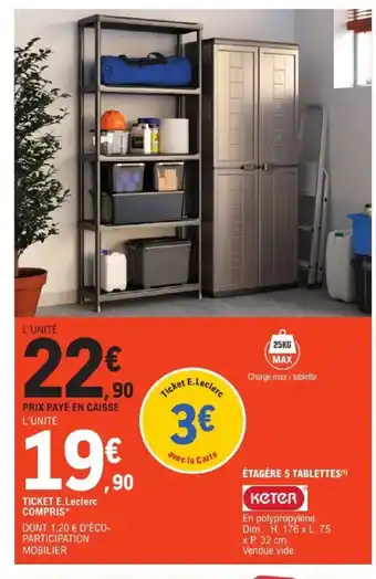 Actuellement en offre chez E.Leclerc Brico : KETER Étagère 5 tablettes ✅ Valable du 27-01 au 7-02.