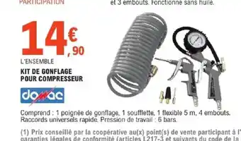 Le prix de l'offre Kit de gonflage pour compresseur se trouve également en haut de la page, ainsi que la date à laquelle l'offre est disponible. Vous pouvez également vérifier les prix dans le Catalogue E.Leclerc Brico actuel ou sur le site Internet de E.Leclerc Brico. Les offres vous permettent d'acheter les produits E.Leclerc Brico au prix le plus bas.