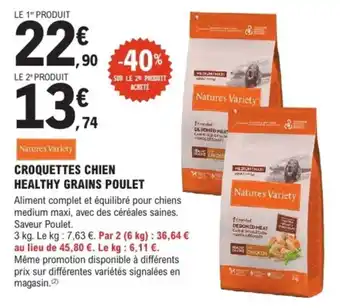 Actuellement en offre chez E.Leclerc Brico : Nature's variety croquettes chien healthy grains poulet ✅ Valable du 10-02 au 21-02.