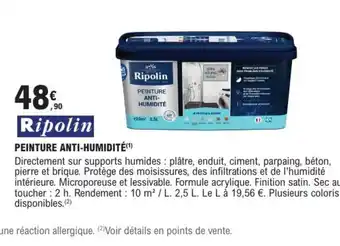En plus de l'offre RIPOLIN Peinture anti-humidité, E.Leclerc Brico propose une large gamme de produits. Consultez le Catalogue E.Leclerc Brico hebdomadaire pour découvrir les meilleures offres et promotions. En plus de RIPOLIN Peinture anti-humidité, il y a aussi : RIPOLIN Sous-couche anti-humidité, RIPOLIN Peinture laque déco & RIPOLIN Peinture esprit déco.