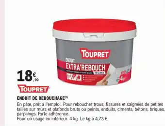 En plus de l'offre TOUPRET Enduit de rebouchage, E.Leclerc Brico propose une large gamme de produits. Consultez le Catalogue E.Leclerc Brico hebdomadaire pour découvrir les meilleures offres et promotions. En plus de TOUPRET Enduit de rebouchage, il y a aussi : TOUPRET Enduit de rebouchage, TOUPRET ENDUIT DE LISSAGE & TOUPRET Enduit de lissage.