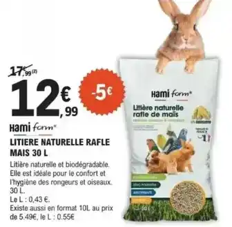 En plus de l'offre Litiere naturelle rafle, E.Leclerc Jardi propose une large gamme de produits. Consultez le Catalogue E.Leclerc Jardi hebdomadaire pour découvrir les meilleures offres et promotions. En plus de Litiere naturelle rafle, il y a aussi : Hami form* LITIERE NATURELLE RAFLE MAIS 30 L, Hami form litiere naturelle rafle mais & Hami form litiere naturelle rafle mais.