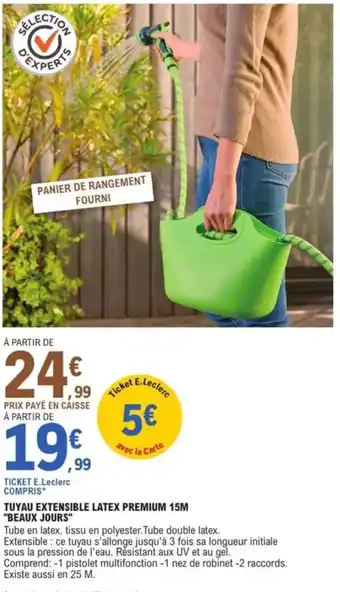 Actuellement en offre chez E.Leclerc Jardi : Tuyau extensible latex premium beaux jours ✅ Valable du 17-02 au 28-02.