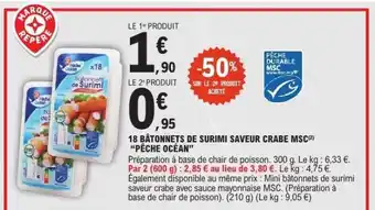 Actuellement en offre chez E.Leclerc : 18 BÂTONNETS DE SURIMI SAVEUR CRABE MSC 'PÊCHE OCÉAN' ✅ Valable du 7-04 au 18-04.