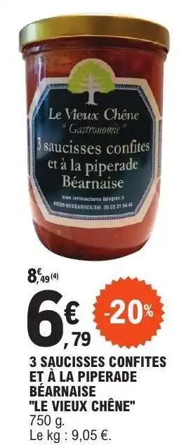 Actuellement en offre chez E.Leclerc : 3 SAUCISSES CONFITES ET À LA PIPERADE BÉARNAISE LE VIEUX CHÊNE ✅ Valable du 3-02 au 7-02.