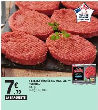 Actuellement en offre chez E.Leclerc : 4 STEAKS HACHÉS 5% MAT. GR. 'CHARAL' ✅ Valable du 24-02 au 7-03.