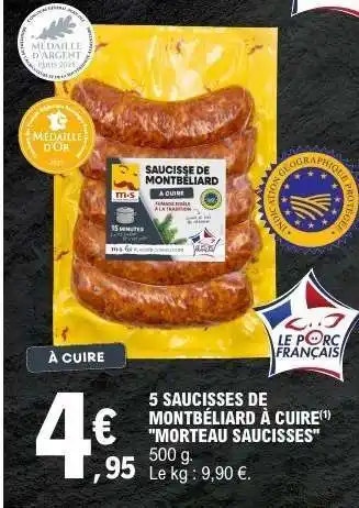 Actuellement en offre chez E.Leclerc : 5 SAUCISSES DE MONTBÉLIARD À CUIRE MORTEAU SAUCISSES ✅ Valable du 17-03 au 28-03.