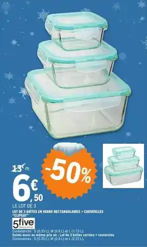 Actuellement en offre chez E.Leclerc : 5five - lot de 3 boîte de vivres sectangulaires + couveclles ✅ Valable du 7-01 au 17-01.