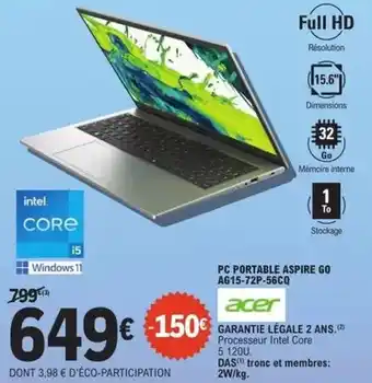 Acer - pc portable aspire go a615-72p-56cq offres et promotions en ligne chez E.Leclerc