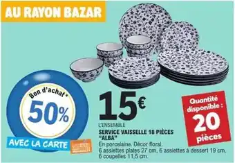 L'offre est disponible dans plusieurs magasins, vérifiez tous les produits pour obtenir le Alba - service vaisselle 18 pièces le moins cher. Si vous souhaitez savoir si l'article est en vente avec une plus grosse remise dans un autre magasin, consultez la catégorie 'Supermarché'. Ces offres pourraient aussi vous intéresser : Service de vaisselle Monochrome 18 pièces, Service de vaisselle Serenia 12 pièces & Service vaisselle 12 pièces gamme mood.