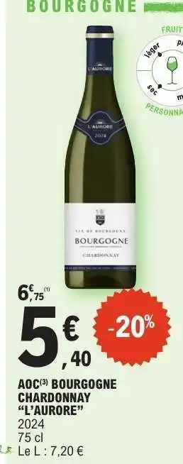 Actuellement en offre chez E.Leclerc : AOC Bourgogne Chardonnay 'L'Aurore' 2024 ✅ Valable du 17-03 au 28-03.