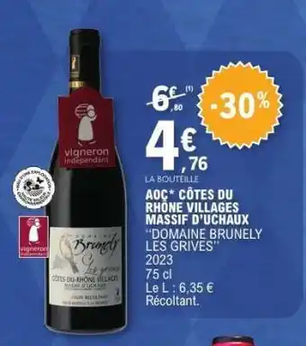 Offre AOC* CÔTES DU RHÔNE VILLAGES MASSIF D'UCHAUX DOMAINE BRUNELY LES GRIVES 2023 chez E.Leclerc