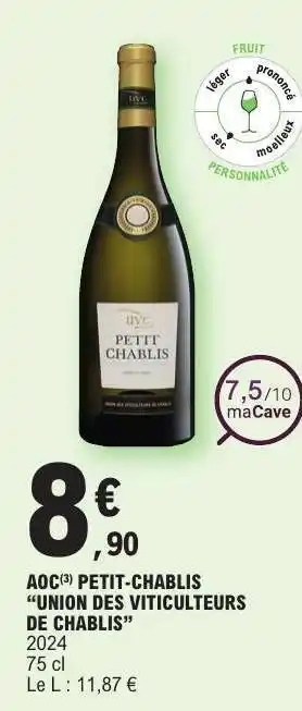 En plus de l'offre AOC Petit Chablis Union des Viticulteurs de Chablis, E.Leclerc propose une large gamme de produits. Consultez le Catalogue E.Leclerc hebdomadaire pour découvrir les meilleures offres et promotions. En plus de AOC Petit Chablis Union des Viticulteurs de Chablis, il y a aussi : AOC** Chablis 'Union des Viticulteurs de Chablis', Aoc - bourgogne chardonnay union des viticulteurs de chablis & Chablis aoc.
