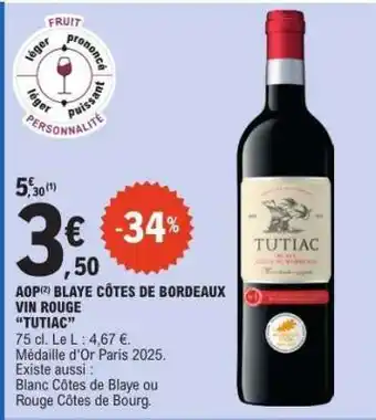 AOP Blaye Côtes de Bordeaux Vin Rouge 'Tutiac' : offres et promos E.Leclerc à découvrir