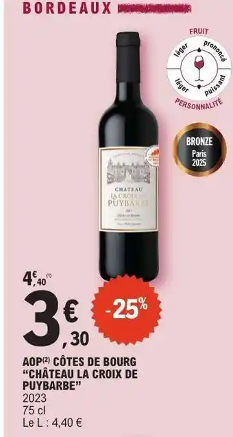 Actuellement en offre chez E.Leclerc : AOP CÔTES DE BOURG “CHÂTEAU LA CROIX DE PUYBARBE” ✅ Valable du 17-03 au 28-03.