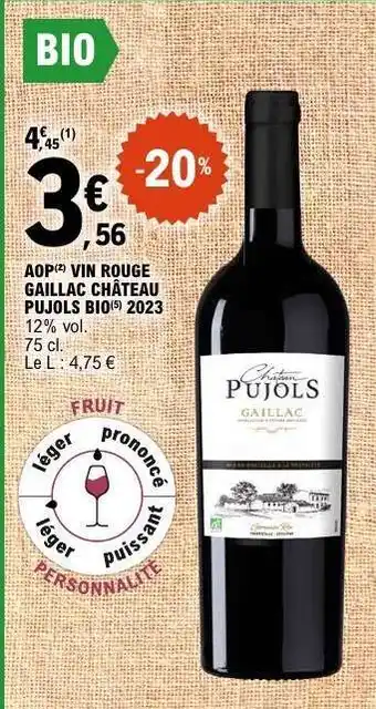 Offre AOP Vin Rouge Gaillac Château Pujols Bio 2023 chez E.Leclerc