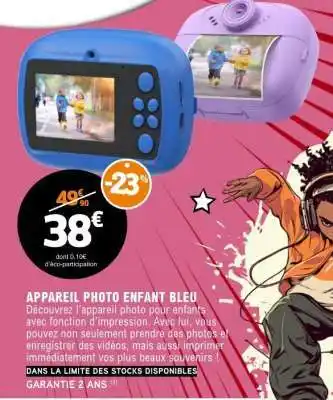 En plus de l'offre APPAREIL PHOTO ENFANT BLEU, E.Leclerc propose une large gamme de produits. Consultez le Catalogue E.Leclerc hebdomadaire pour découvrir les meilleures offres et promotions. En plus de APPAREIL PHOTO ENFANT BLEU, il y a aussi : Instax - appareil photo instantane, Appareil photo instantané vision & Fujifilm appareil photo instantané.