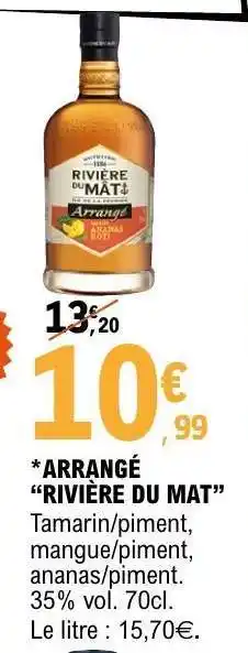 En plus de l'offre ARRANGÉ “RIVIÈRE DU MAT”, E.Leclerc propose une large gamme de produits. Consultez le Catalogue E.Leclerc hebdomadaire pour découvrir les meilleures offres et promotions. En plus de ARRANGÉ “RIVIÈRE DU MAT”, il y a aussi : Rhum arrangé RIVIERE DU MAT, RHUM BLANC TRADITIONNEL “RIVIÈRE DU MÂT” & Carrefour - rhum arrangé.