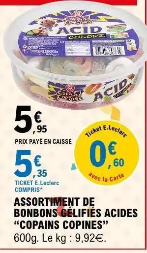 Actuellement en offre chez E.Leclerc : ASSORTIMENT DE BONBONS GÉLIFIÉS ACIDES “COPAINS COPINES” ✅ Valable du 10-02 au 22-02.