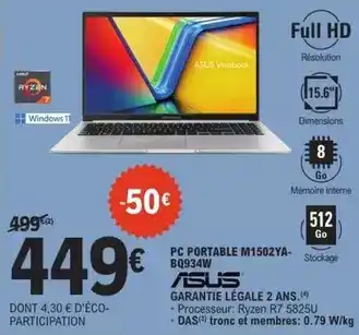 Actuellement en offre chez E.Leclerc : Asus - pc portable m1502ya- b093aw ✅ Valable du 27-01 au 7-02.