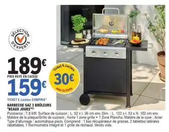 Actuellement, BARBECUE GAZ 3 BRÛLEURS BEAUX JOURS est en promotion chez E.Leclerc. Toutes les informations utiles comme le prix, les conditions et la durée de validité sont affichées sur cette page. Consultez également les promotions similaires pour BARBECUE GAZ 3 BRÛLEURS BEAUX JOURS, afin de faire le meilleur choix. La promo BARBECUE GAZ 3 BRÛLEURS BEAUX JOURS est valable du 31-03-2026 au 18-04-2026. Si elle est expirée, regardez les autres offres équivalentes. Vous pouvez aussi suivre cette catégorie de produit pour être alerté lorsqu’une nouvelle promotion BARBECUE GAZ 3 BRÛLEURS BEAUX JOURS apparaît chez E.Leclerc.Questions fréquemment posées au sujet de BARBECUE GAZ 3 BRÛLEURS BEAUX JOURS