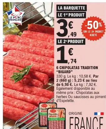 En plus de l'offre Bigard 6 chipolatas tradition, E.Leclerc propose une large gamme de produits. Consultez le Catalogue E.Leclerc hebdomadaire pour découvrir les meilleures offres et promotions. En plus de Bigard 6 chipolatas tradition, il y a aussi : 6 Chipolatas Tradition 'Bigard', 6 chipolatas & 18 chipolatas.
