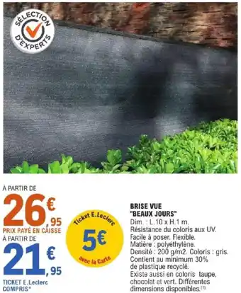 En plus de l'offre BRISE VUE BEAUX JOURS, E.Leclerc propose une large gamme de produits. Consultez le Catalogue E.Leclerc hebdomadaire pour découvrir les meilleures offres et promotions. En plus de BRISE VUE BEAUX JOURS, il y a aussi : Beaux jours BRISE-VUE, Dim - brise vue beaux jours & BRISE-VUE.