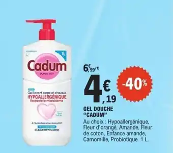En plus de l'offre CADUM Gel douche, E.Leclerc propose une large gamme de produits. Consultez le Catalogue E.Leclerc hebdomadaire pour découvrir les meilleures offres et promotions. En plus de CADUM Gel douche, il y a aussi : Cadum - gel douche, Gel Douche Cadum & Gel Douche Cadum.