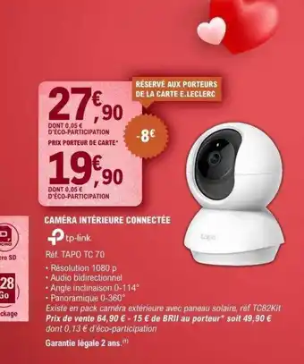 Le prix de l'offre Caméra intérieure connectée se trouve également en haut de la page, ainsi que la date à laquelle l'offre est disponible. Vous pouvez également vérifier les prix dans le Catalogue E.Leclerc actuel ou sur le site Internet de E.Leclerc. Les offres vous permettent d'acheter les produits E.Leclerc au prix le plus bas.
