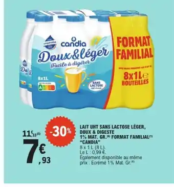 Actuellement en offre chez E.Leclerc : CANDIA Lait uht sans lactose léger, doux & digeste 1% mat. gr. format familial ✅ Valable du 3-03 au 14-03.