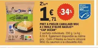 Actuellement en offre chez E.Leclerc : CAP OCÉAN Pret a poeler cabillaud msc a l'huile d'olive basilic ✅ Valable du 13-01 au 24-01.