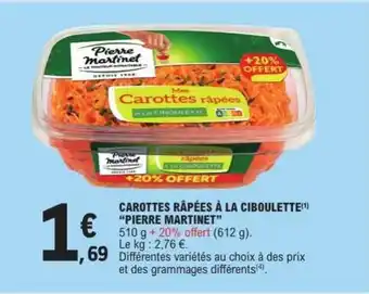 Le prix de l'offre Carottes Râpées à la Ciboulette Pierre Martinet se trouve également en haut de la page, ainsi que la date à laquelle l'offre est disponible. Vous pouvez également vérifier les prix dans le Catalogue E.Leclerc actuel ou sur le site Internet de E.Leclerc. Les offres vous permettent d'acheter les produits E.Leclerc au prix le plus bas.