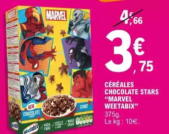 Actuellement en offre chez E.Leclerc : CÉRÉALES CHOCOLATE STARS “MARVEL WEETABIX” ✅ Valable du 13-01 au 25-01.